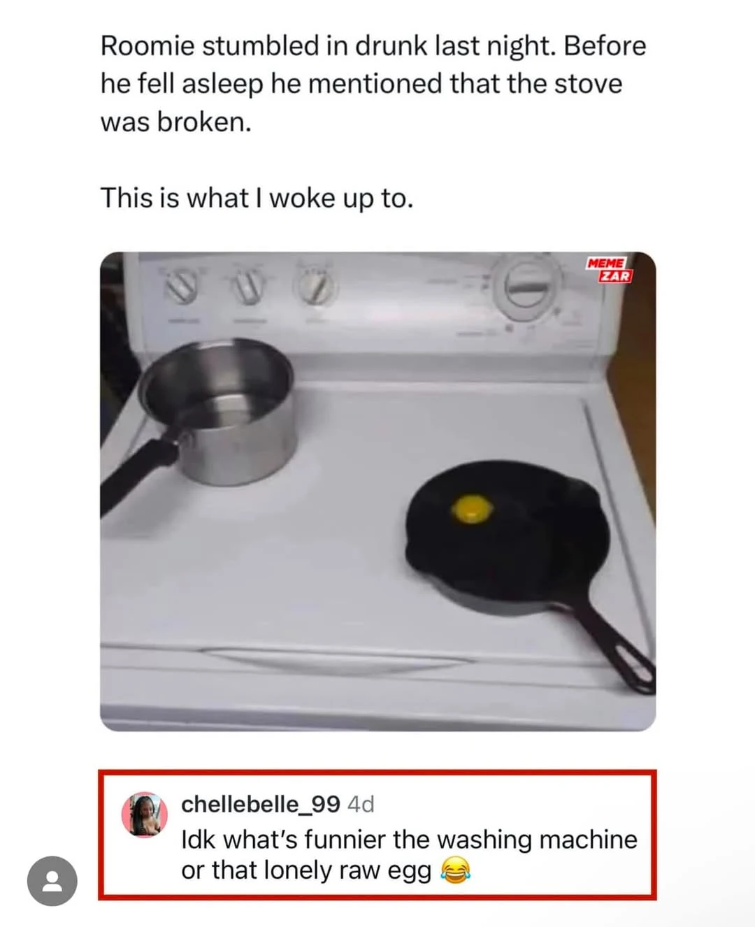 A drunken man attempted a fried egg meme, mistakenly believing the washing machine to be a stove.
